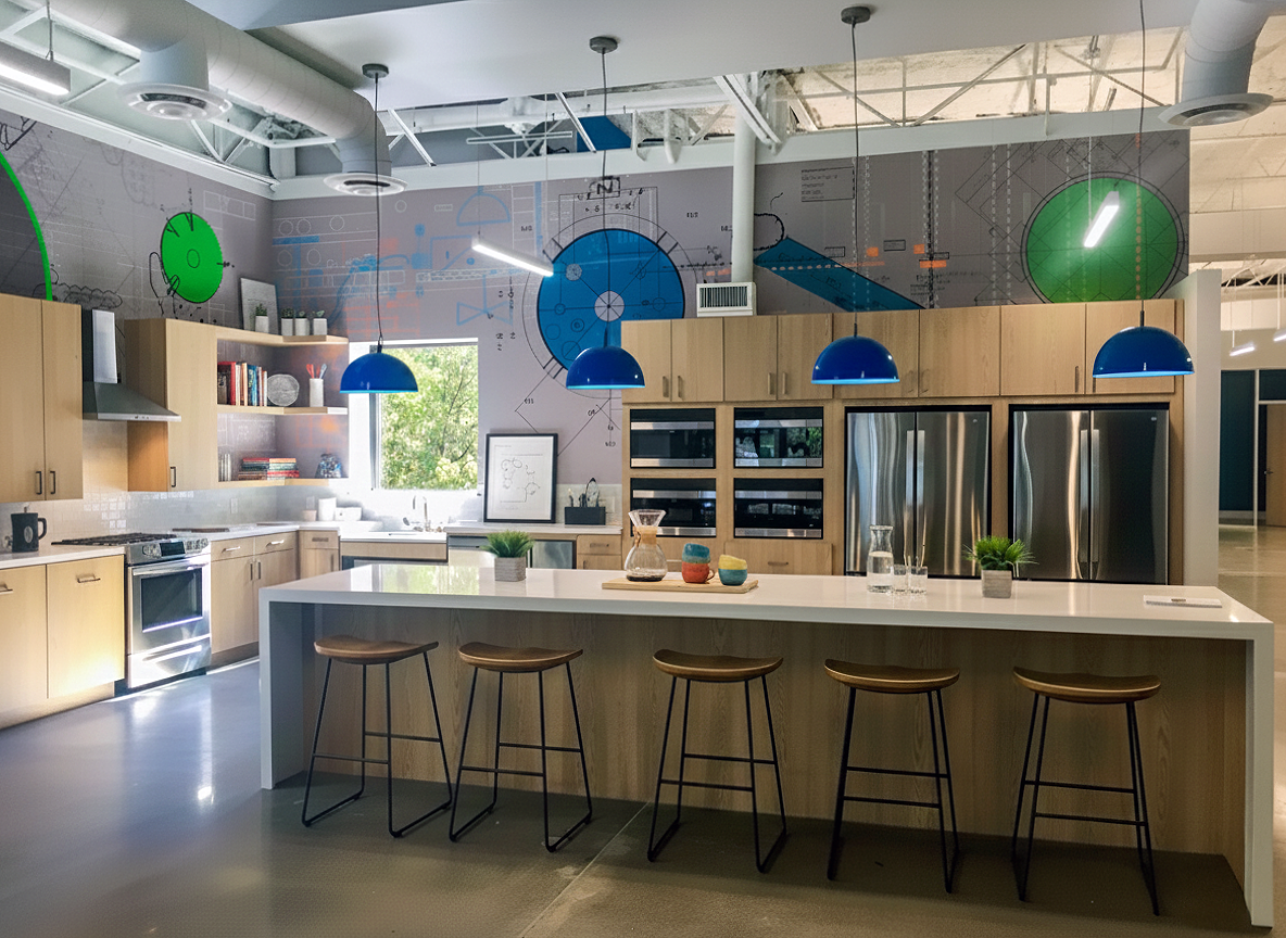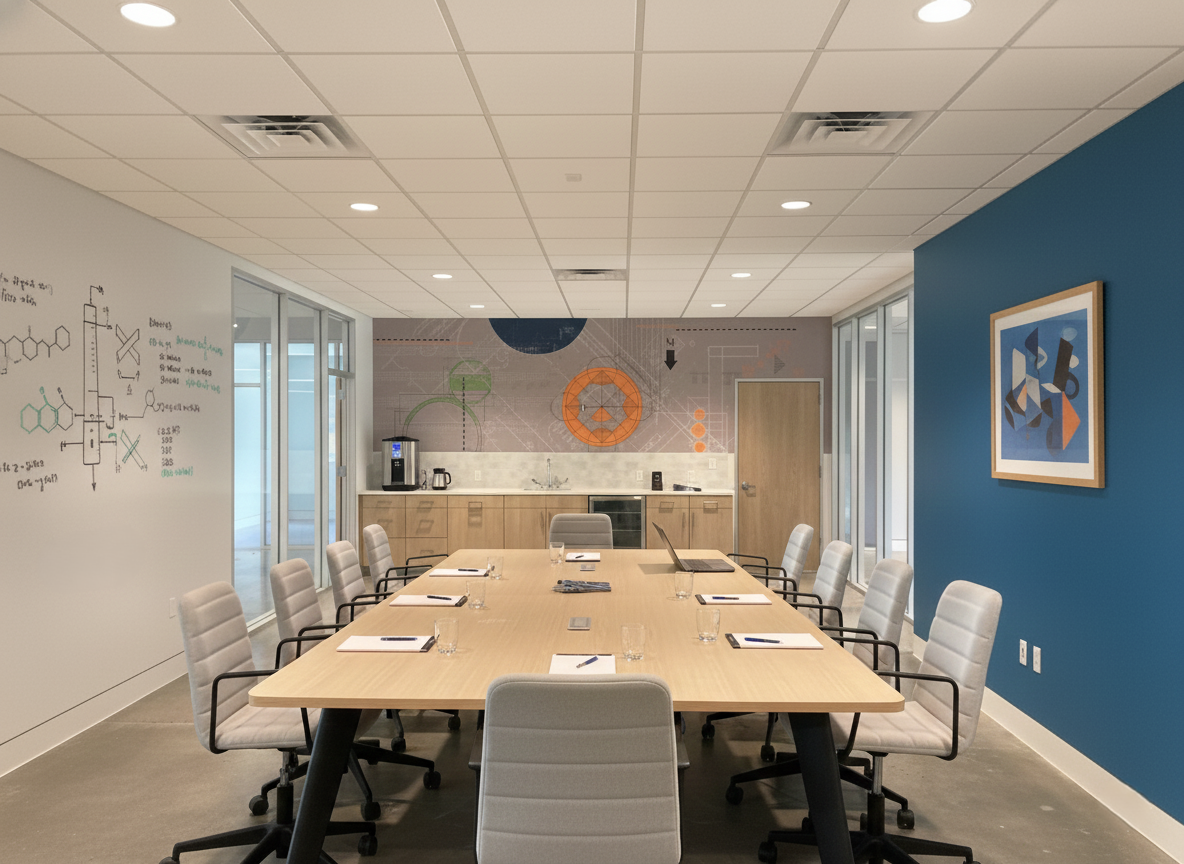A defining feature of the project is a bespoke wallcovering that serves as a tribute to the firm’s heritage. Our design team collaborated with a specialist wallpaper studio to create a custom pattern that integrates the company’s original hand sketches and founding CAD drawings. By providing creative direction on color palettes and composition, we transformed technical artifacts into a sophisticated textural element that bridges the company’s history with its new, modern environment.